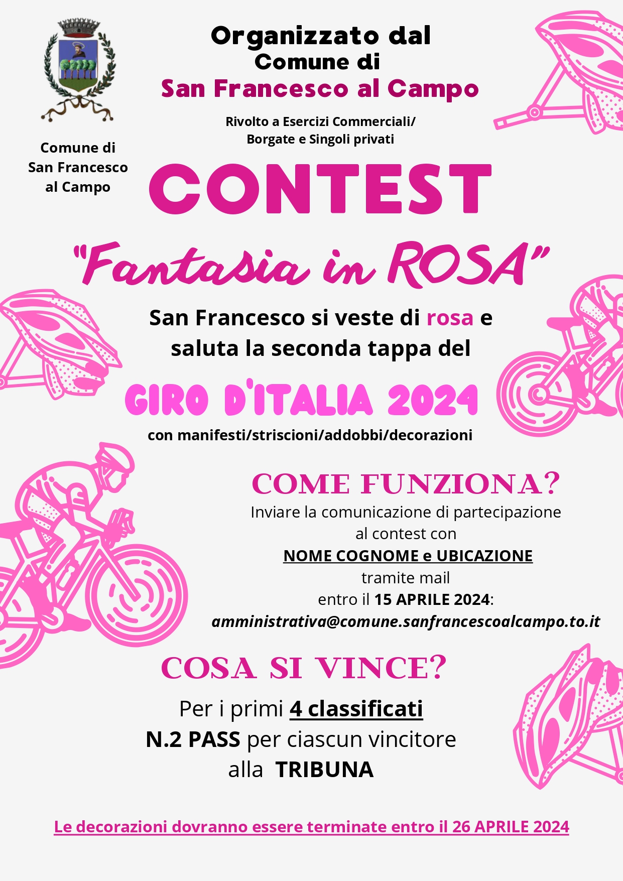 In occasione del Giro d'Italia, San Francesco al Campo si veste di rosa e organizza il contest rivolto a tutti (esercizi commerciali, borgate e privati) per rendere più rosa il paese.