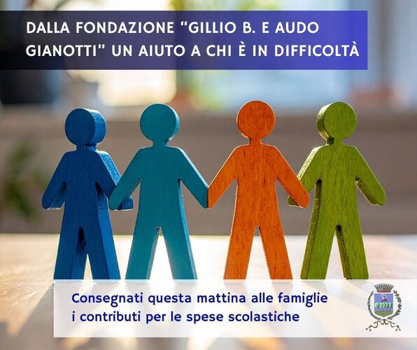 Questa mattina in municipio sono stati consegnati gli assegni alle due famiglie che tramite il Comune hanno richiesto il contributo messo a disposizione dalla Fondazione “Gillio B. e Audo Gianotti” Onlus di Vauda Canavese a sostegno delle spese scolastiche dei nuclei familiari residenti con un reddito ISEE inferiore a 10.000 euro e i cui figli hanno superato con profitto l'ultimo anno scolastico.