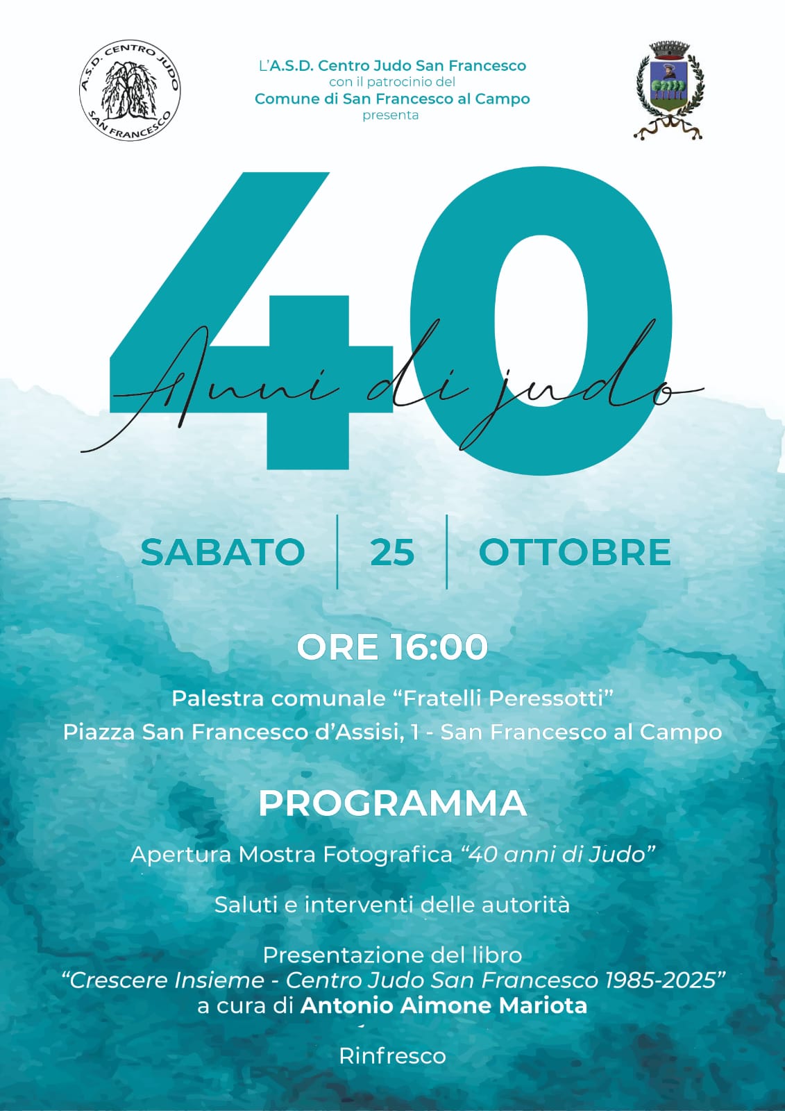 Questo sabato, 25 ottobre, siamo tutti invitati nella palestra comunale "Fratelli Peressotti" per un evento speciale: l'Asd Centro Judo San Francesco celebra i suoi primi 40 anni di storia. L'appuntamento è alle ore 16. Il programma prevede una mostra fotografica sulla vita dell'associazione dal 1985 ad oggi, il saluto delle autorità e la presentazione del libro che il maestro Antonio Aimone Mariota ha scritto per celebrare il prestigioso traguardo. Seguirà il rinfresco.
