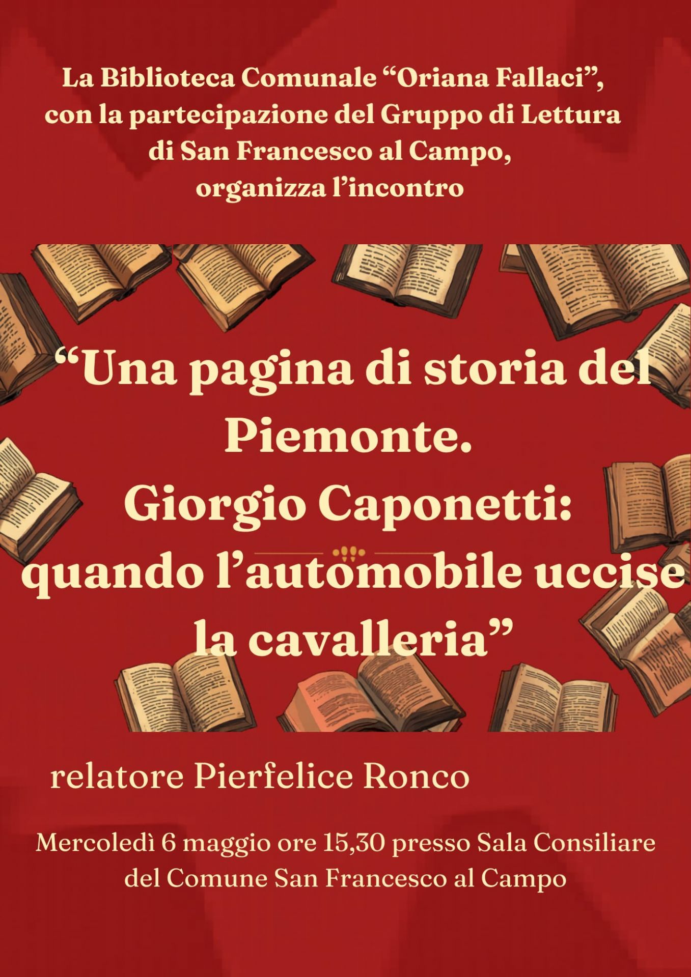 "Una pagina di storia del Piemonte. Giorgio Caponetti: quando l'automobile uccise la cavalleria" è il tema dell'incontro con Pierfelice Ronco organizzato dalla Biblioteca Comunale con la partecipazione del Gruppo di Lettura di San Francesco al Campo.