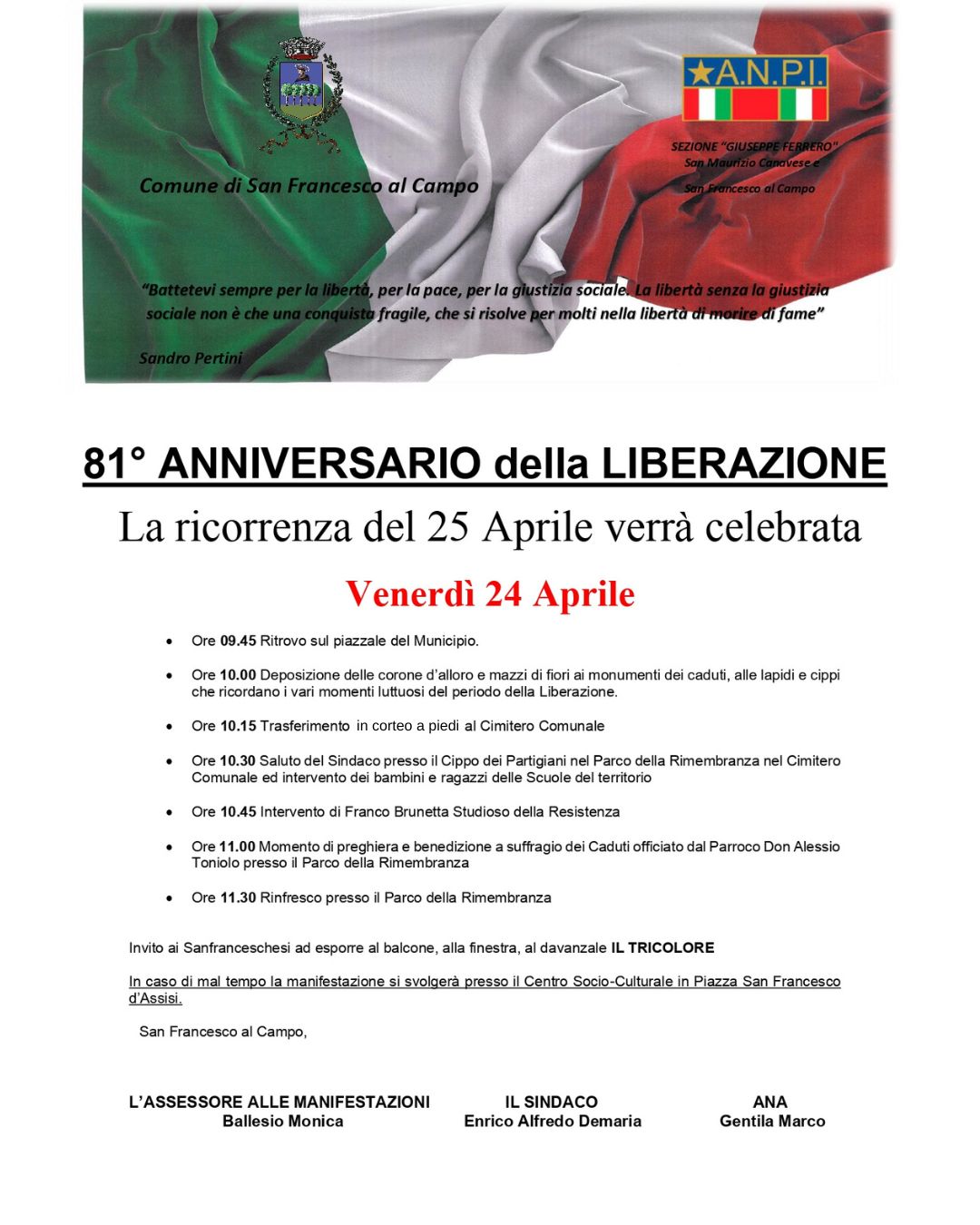 Il Comune di San Francesco al Campo solennizzerà l'81° anniversario della Liberazione con una cerimonia venerdì 24 aprile.